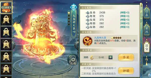 2、法宝更是强悍法器,目前一共有7种法宝,每种法宝的技能效果都不相同,有造成伤害的法宝,也有回复生命的法宝,需要消耗一定数量的法宝碎片解锁完整法宝,战斗中可以携带一种法宝进行强力打击,法宝升至五星后可进行法宝觉醒,进一步提升法宝属性。