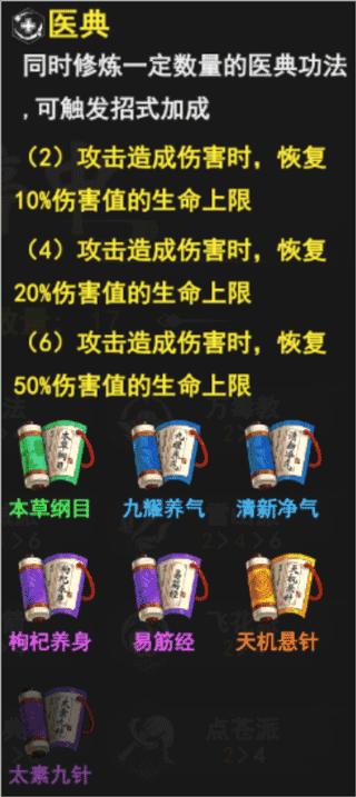 2、6医典或4医典(个人偏爱6医典,回血嘎嘎多),因医典有7个功法选择,各位可以看发牌员以及实际搭配情况来选择6个即可~