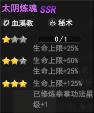 太阴炼魂(血溪教、秘术)——升至3星使已修炼拳掌功法星级+1,提升攻击力