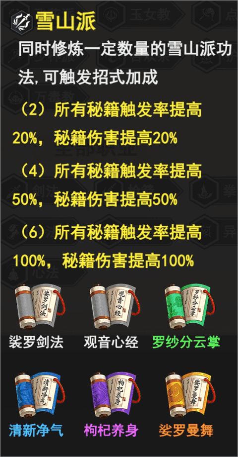 4、6雪山派,提升秘籍触发概率和秘籍伤害,剑法“一剑开天”,刀法“纯阳刀法”升到2星解锁的秘籍技能配合起来,可以打出高额伤害