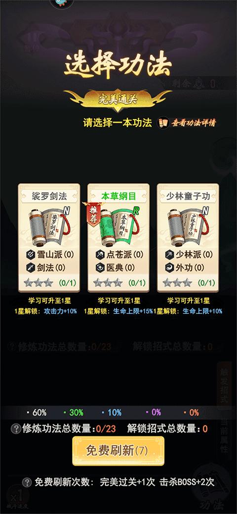 2、挑战时玩家还需要为角色选择一本合适的功法,只有合理的搭配出最强的招式才能抵抗最强劲的敌人