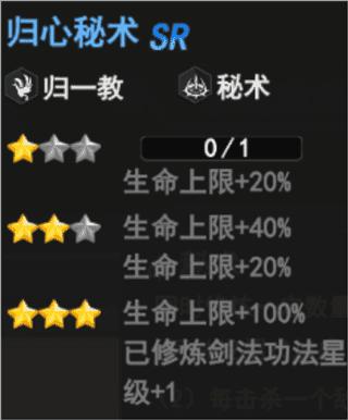 归心秘术(归一教、秘术)——升至3星使已修炼剑法功法星级+1,提升攻击力