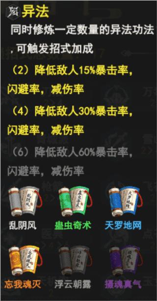 4、4异法,选“忘我魂灭”“天罗地网”“蛊虫奇术”“乱阴风”(四个足矣,不用特地凑6异法),降低敌人30%暴击、闪避、减伤,这个效果对boss蛮有用的
