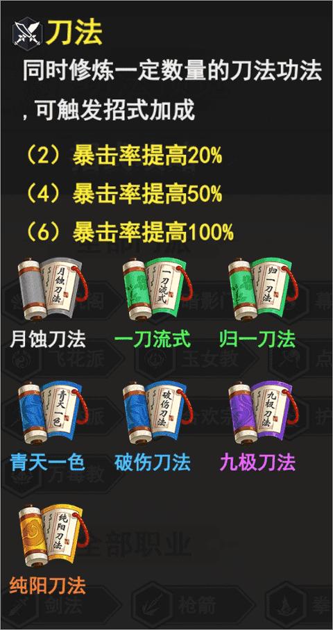 1、6刀法必拿,提高暴击率,简单粗暴,配合“暗影门”提高的暴击伤害,可以打出非常高额的伤害。刀法的功法共有7个,拿6个即可,月蚀刀法可以不用拿,不过具体也看发牌员的情况