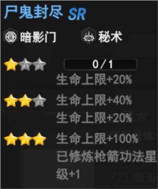尸鬼封尽(暗影门、秘术)——升至3星使已修炼枪箭功法星级+1,提升攻击力