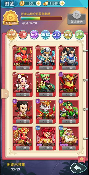 图鉴类型包括英雄(三个派系)、战宠、装备、护符,在首次获得他们或者进行升星后可领取积分