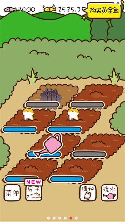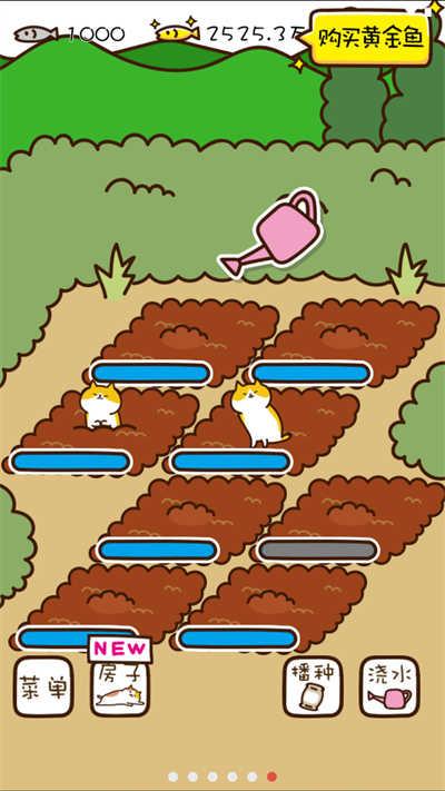 从商店里买猫咪种子,然后到地里种下,浇水,会提示过几分钟猫咪就会长出来了,长出头后再过几分钟就可以收获了,收获猫后会自动获得小鱼干,也可能有金小鱼干,可以在商店买种子,道具和房间背景。
