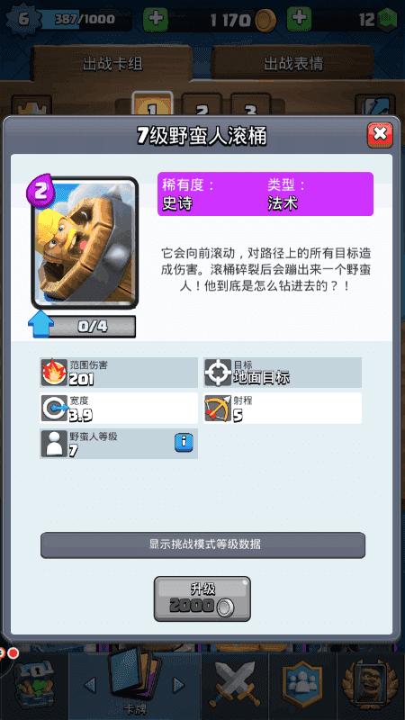 4、野蛮人滚桶:2滴圣水解锁,是小型骷髅兵的克星,对付女巫或者骷髅军团首选,并且耗率低,在其他卡组没有解锁的时候,可以应急。