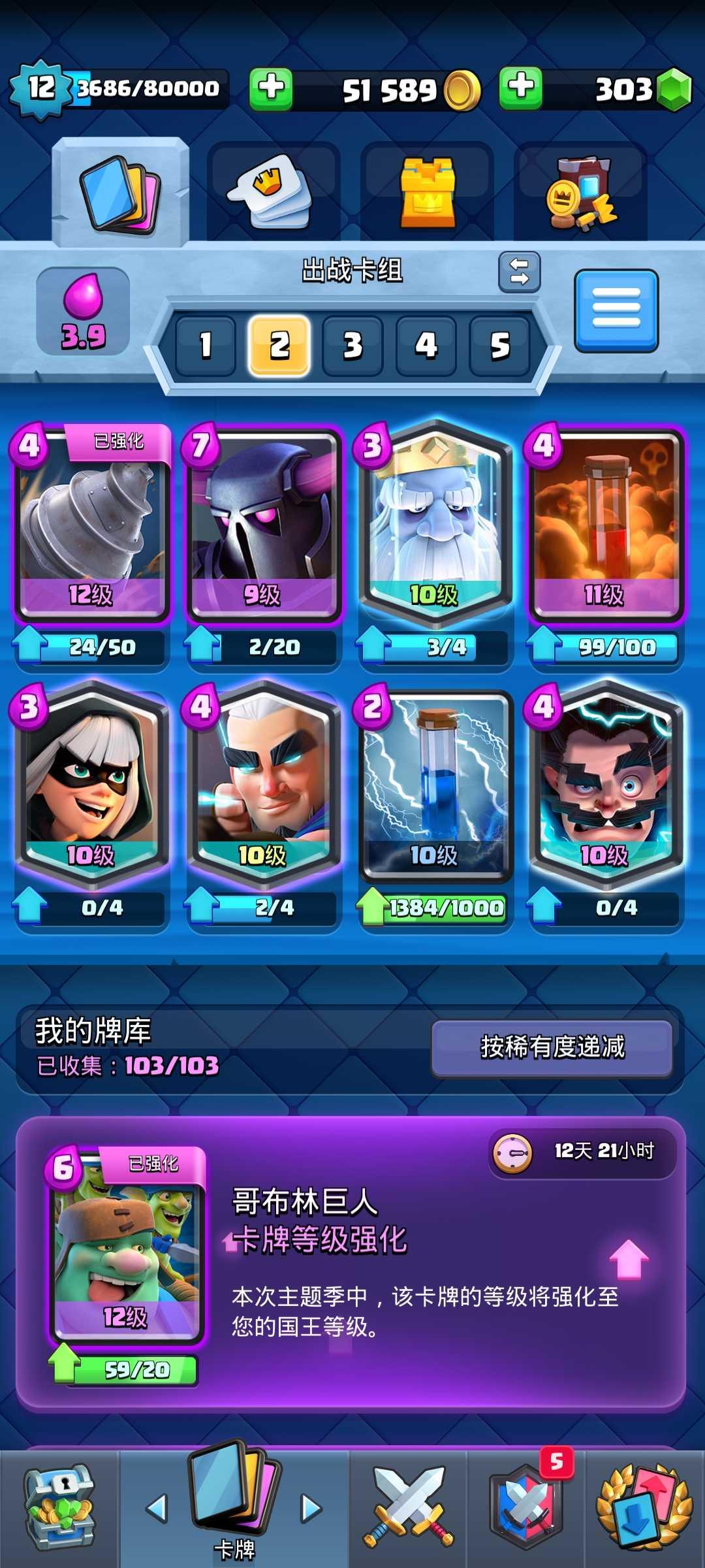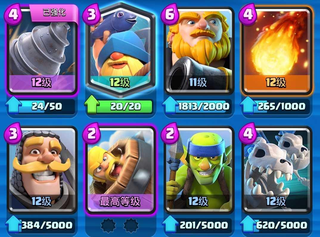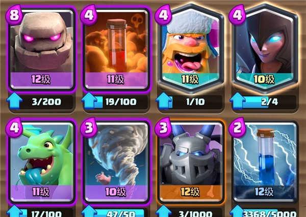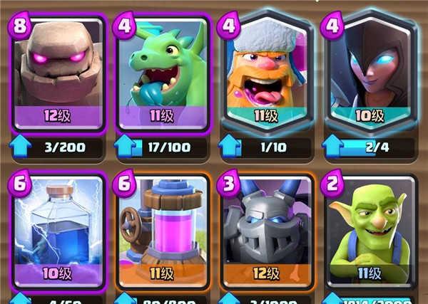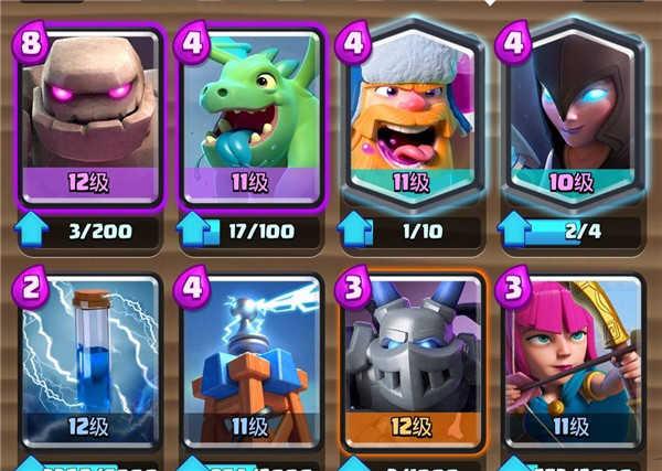2、挑选卡组:小编觉得还是不要自配卡组,因为局限性太大,不利于长期发展。全球榜前200名的卡组都可以去参考一下,在其中挑选卡组的时候要注意,传奇卡1张,因为传奇卡不能捐收,所以很难升到满级,容易长期被等级压制,史诗卡1-2张,毕竟史诗卡只能在周日请求捐赠,所以1-2张最为适宜,稀有卡2-3张,稀有卡升级的速度比普通卡要慢太多,前期你可能感觉不到,但是小编深有体会,普通卡没什么要求,毕竟最容易升级的就是普通卡。卡组缺少个别卡牌怎么办?小编建议呢,你可以暂时用别的卡牌暂代,在你上了10阶后商店会刷出传奇卡,如果有需要的直接买就行,不要在乎金币,记住没卡比没金币更难受!在你上了11阶后除了传奇卡其它卡牌很容易就凑齐的,等级不够可以去部落要卡,快速升上来就行了。配好一套卡组,就不要浪费金币升级其它不相关的卡牌,切勿三心二意!一心一意一套卡,多打多练早日上联赛。