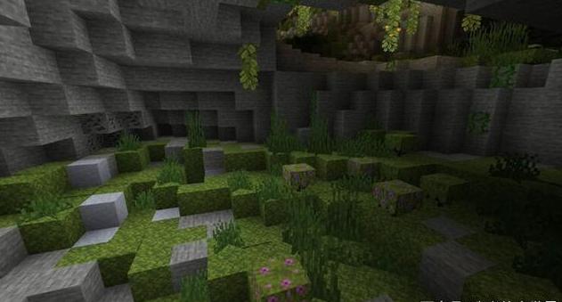 3、与此同时,苔藓块和苔藓地毯会覆盖繁茂洞穴的地板和天花板,孢子花会生长在洞顶上面,并且会滴落粒子,看上去就像是落叶一样的效果,还有在上面长了垂滴叶的黏土方块池塘。