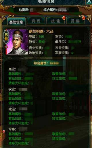 大臣的属性是国力的重要组成部分。在翰林院培养大臣是提升国力的最快速方法。在大臣的基础信息中,我们可以看到,大臣的属性有基础属性,联盟加成,官品加成,珍宝加成以及清帝光环加成。