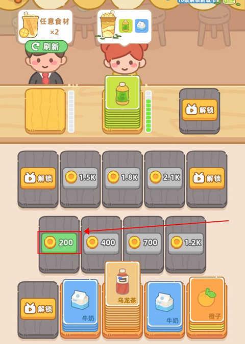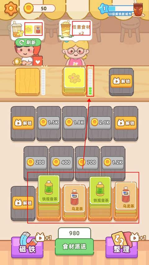 1、游戏以经营玩法为主,玩家需要根据客户的需要,放置合适的奶茶卡牌,放满十张即可制作奶茶。