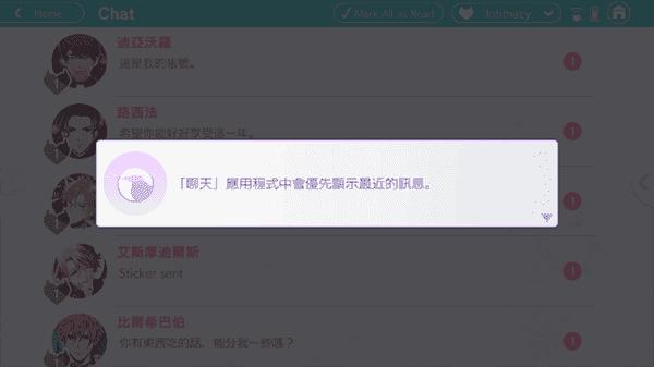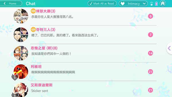 5、聊天界面会显示最近的讯息,旁边的数字会显示角色的好感度,提升好感度收到的信息就越多