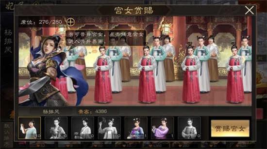 圣上可以通过赏赐宫女给佳人,提高佳人的亲密度。亲密度越高,佳人诞下的子嗣属性也越强,对于圣上提升国力有很大帮助!