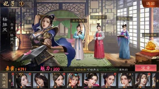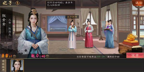 前面提过佳人的亲密度影响子嗣属性、魅力值影响技能经验获取;而子嗣和佳人技能对亲属大臣属性的提升十分明显,所以在培养佳人时,尤其是前期如果以提升国力为前提,只能请圣上忍住博爱之心,宫女和饰品的赏赐做到有的放矢、物尽其用。