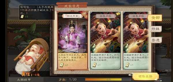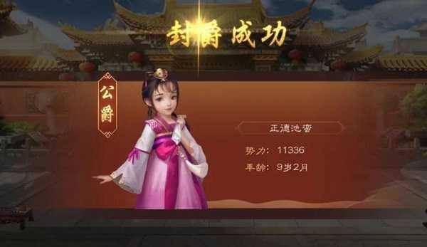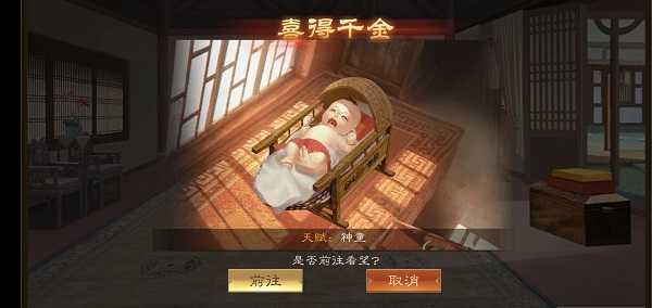 国君获得第一名子嗣时即可开启【中庭(东宫)】,玩家可以为子嗣取名、培养子嗣成长,培养过程中会触发抓周、封爵等玩法,还有概率触发随机事件获得属性大幅提升的机会。