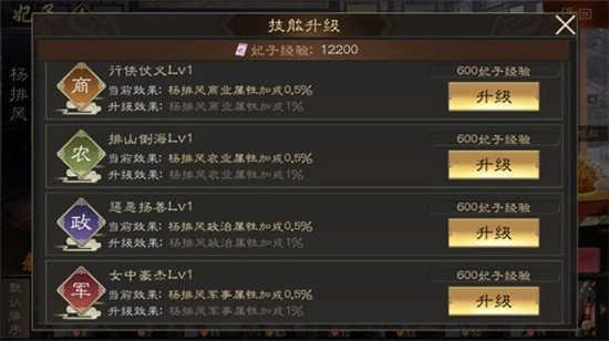 ③技能:大臣技能在兵部使用。君上可在六部派遣大臣处理事件获得经验,升级技能。
