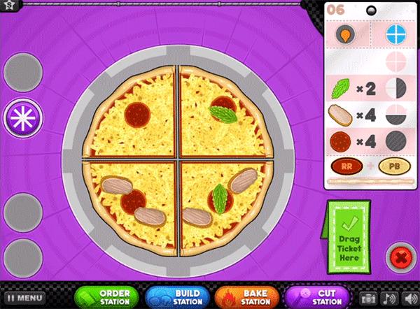 在Papa's Pizzeria,顾客会订购切成四块、六块或八块的披萨。要切片比萨饼,玩家必须在比萨饼上拖动鼠标(或滑动手指)以确定比萨饼切片机在比萨饼上的路径。如果切的片数不正确,或者片大片小,则在将披萨呈现给顾客时将被扣分。