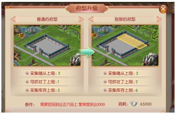 府邸升级后,玩家的采集随从上限会增加,可抓获的抓丁上限增加,采集库存上限会增加,而且小主的府邸空间会更大更好看;