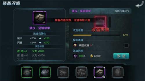装备改造时,成功率是随着改造等级的提升而降低的,因此会发生失败的概率,并且失败后有可能会造成改造等级下降。对于高改造等级装备的再次改造,我们建议玩家使用改造的保底道具——精密仪器,它可以确保改造失败后改造等级不降低。精密仪器在商城有售,同时完成每日任务的玩家可以从奖励中获得。