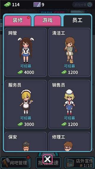 与大多数模拟经营游戏一样,玩家需要通过推广或者是做活动来吸引人气,争取更多的客户以及会员,比如大家都熟悉的冲100送100。同时还需要雇佣员工,让他们来打点好网吧各种事务,当然漂亮可爱的女网管说不定能吸引更多人气的哦~