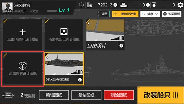 当您第一次进入港区时,您会获得一张“DE-X型护航驱逐舰”的图纸。您可点击右下方黄色”建造战舰“按钮直接进行建造,但在此之前,我们建议您自行设计战舰以体验工艺战舰的全部乐趣