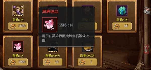 第四个略过,这边来说一下第五个,这个异界结晶的说明上是用于突破宝石的,红色的品质,卖这么贵,还只有一个,一看就很有用,但是不建议买,能有一千瓶盖的一般都是氪佬了,这个东西氪佬一般不会缺,平民也不太建议买,太贵。