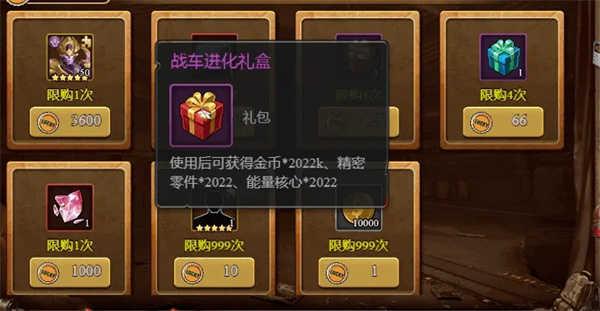 第三个是战车礼包,这个不建议买,这些都有获取渠道,耐心点收集这么多不是难事,而且这个有点贵。