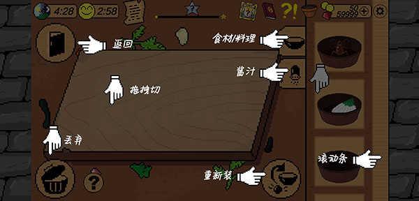 5、返回主页点击菜板,将右侧的食材拖动到左侧的案板上,滑动屏幕就可以进行切菜,还有不同的料汁可以选择进行腌制,完成点击图示右下角的“重新装”放入碗中,不需要的部分话可以点你左下角垃圾桶丢弃。