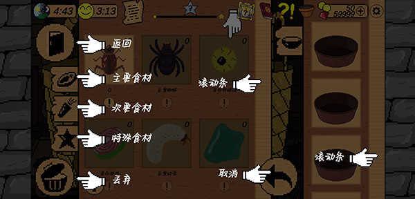 4、点击桌子上的食材框,左侧可以选择主要食材、次要食材以及特殊食材,在主要食材内找到蟑螂,点击3次,再在次要食材内找到洋葱,点击放入右侧的碗具内。