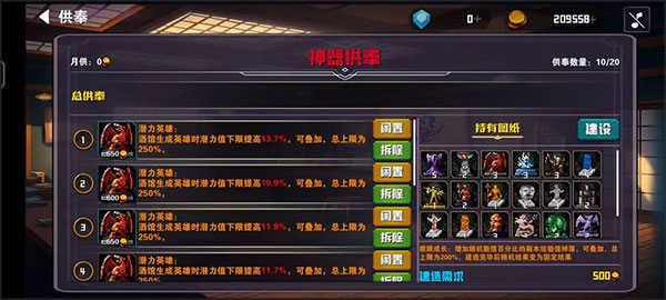 4、供奉:可以建造各种供奉获得各种各样的加成,建造后激活即可获得加成(但是需要消耗金币)