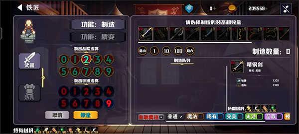 3、铁匠铺:快速提升战力与搞钱的地方,也是本游戏核心功能。第一个地牢刷的材料最高可以制作2阶9级装备。