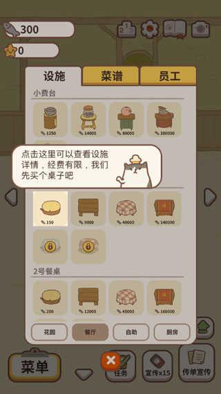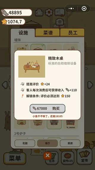 有头脑性的购买即可以涨小鱼干有可以涨星星的那种设施,涨的星星越多越好,但是对应的价格和要求也会高许多,可以多对比一下,在自己的预算范围内选择,最划算的是自助餐厅里的设施,涨星蹭蹭不是问题,小伙伴们不要在按照顺序或者只是一味的只看价钱啦!