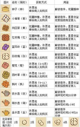升级花园里的设施:花圃一花圃一共分为四个等级,等级越高的花圃种出来的花观赏出的星也越多哦!花园长桌一增加观赏次数,降低种花成本。