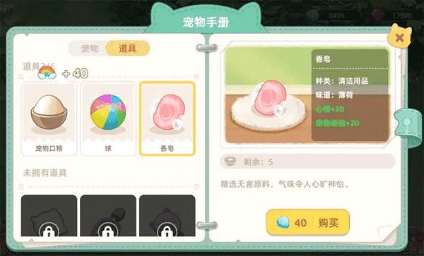 3、点击宠物界面右下角的“宠物手册”按钮进入手册,可以用贝壳购买互动道具,每样道具功能不同加的心情值也不同。
