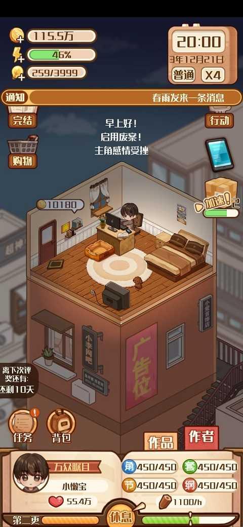 当四维均超过50以后,开始给网红写段子,开局好的话基本上每项学习一次就能都超过50了,不需要给故事会投稿赚钱。网红写段子每次有100-1000块钱,旁边有个幸运草图标达到2/2的时候,下一次一定暴击就是500/1000块。所以基本上写3次段子,必有一次暴击。之后就是反复写段子赚钱,花钱学习,直到四维上限提高到100以后,再通过写书把实际四维均提高到100以上,就可以给明星写微博了,一次200-3000同样每3次必有一次暴击。现在开始写微博,学习,买家具,当实际四维属性均提高到125,并且买了第一个床和电脑之后,游戏开始进入中期。