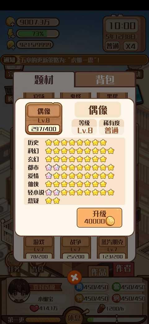 之后就是不停地开新书,满100章就完结刷粉丝,刷钱了。这里要注意一下关于题材,前作1代不能一直写同一个题材,2代你一直写同一个题材,一直写续作也没有影响,所以选择你当前组合起来星级最高的题材写就好了,一直写续作都行。比如我到后期是偶像题材等级比较高,就一直写偶像题材。基本上8级的普通题材能有10星的水平,再加奖状的1星就是11星。