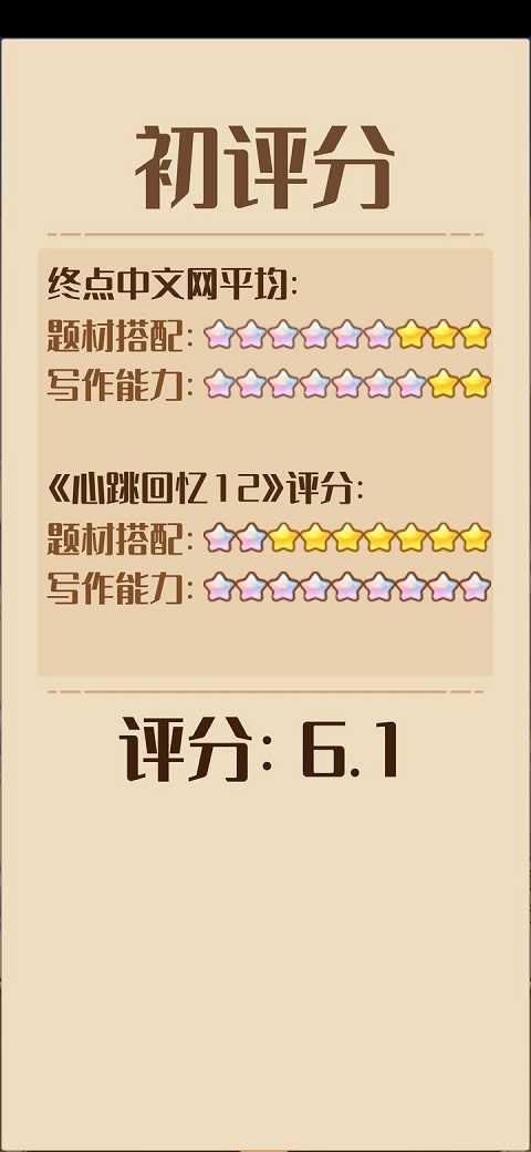 比如你开了一本书,初始评分是6,那你大量或积极投入灵感的情况下,后边评分最高能涨到8分。如果你期间提升了能力值,那这个评分可能慢慢超过8分甚至达到10分,这也就是为什么大家觉得游戏前期初始评分哪怕只有7分,最后也能达到10分,但后期初始评分有7分,最后就不会超过9分,就是因为前期能力值能提升,后期提升的比较慢或者能力值满了,作品最高分就=初始评分+2。