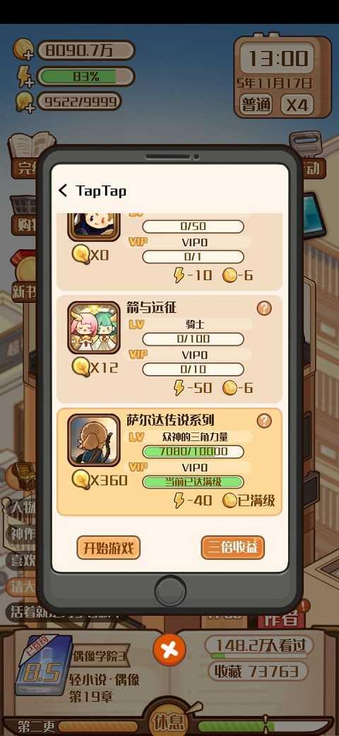 这里注意一下灵感获取的渠道,一个是通过灵感获取的事件,一个是手机自带游戏,手机游戏的灵感获取性价比更高,但是要用大量的体力把等级刷上去才行,我的思路是,第一个游戏的灵感拿满,中间的两个游戏不用管,最后一个游戏塞尔达传说再刷,比如我这里塞尔达传说40点体力就有360灵感,还不用花钱,比灵感事件的性价比高多了,这还不是最高等级。