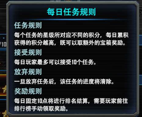 每日任务是玩家获取经验卡和科技点的重要途径,玩家在任务系统中每日最多可完成10个任务,任务分为1-5星,每个星级对应不同的积分和奖励,任务星级越高积分和奖励就越好,每日累计积分越高,即可获取额外的积分宝箱奖励。