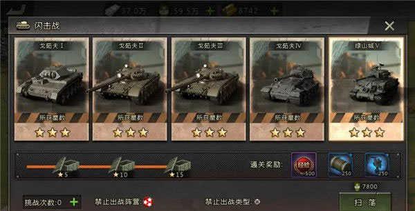 通关或扫荡闪击战关卡,均可进行抽奖,这里是获取配件碎片的主要途径,对比商店直接购买,在这里花钱抽取,性价比还是很高的!另外,对于前期玩家来说,购买闪击战挑战或扫荡次数可额外获得经验,如果正好就差一点经验升级,就不要吝啬于一点金砖了,毕竟高等级=高战力,升级才是王道。