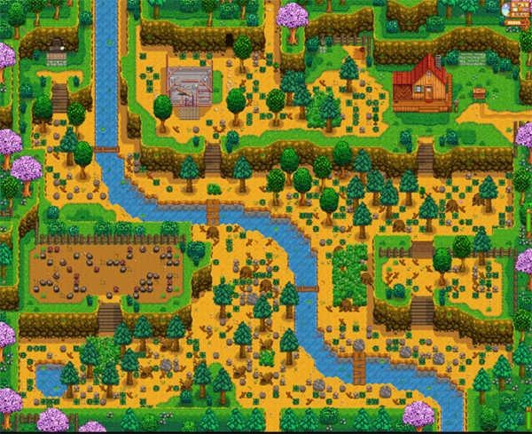 地图地块面积很大,且除正下方与右边的两个池塘以外大部分都是可耕地,是种植农作物和饲养动物的理想选择。