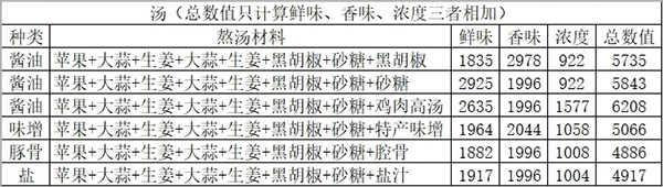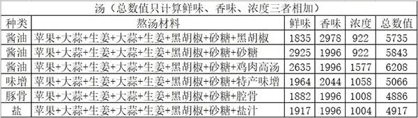 3、熬汤材料的鲜味、香味、浓度搭配数据: