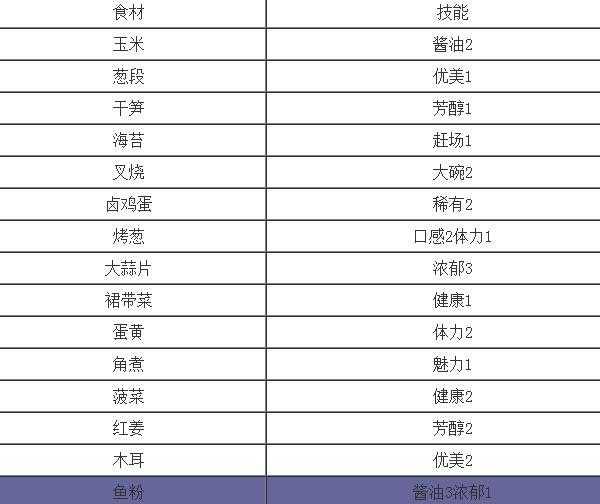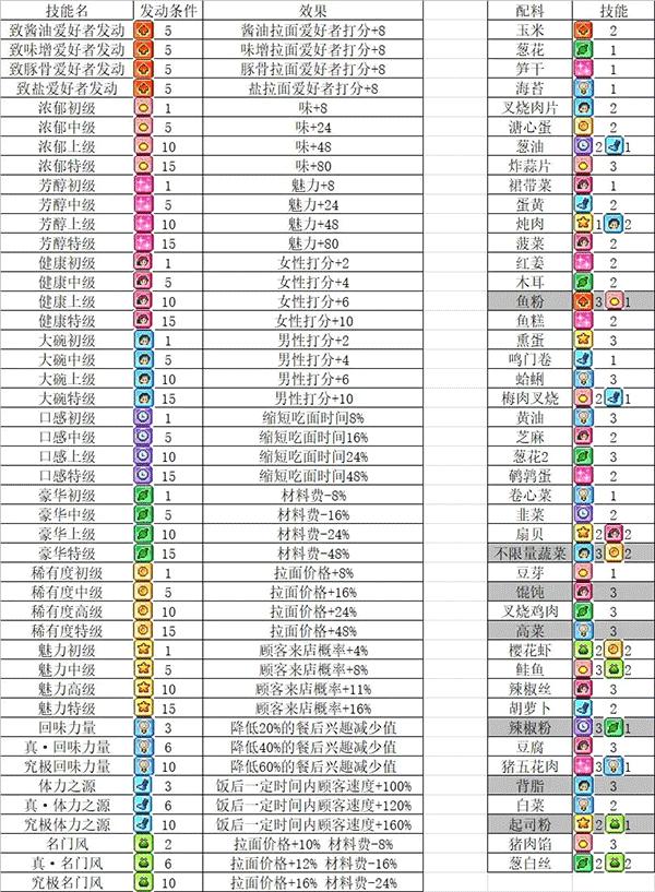 开罗拉面店单独食材技能触发详解:特殊颜色标注的是限量食材,无法购买新的,使用之后如果不卸下的话就没有了