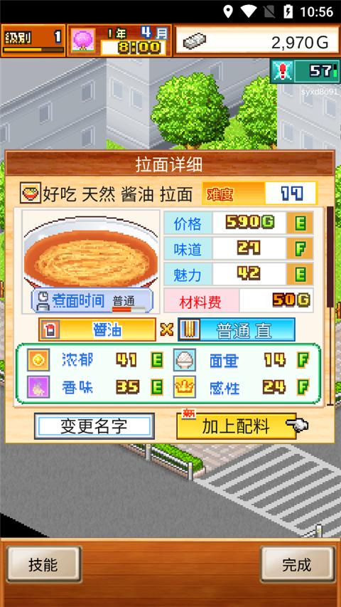 3、制作一个属性很高的拉面,然后加入到所有店铺的菜单,无论厨师能不能做出来。拉面人气也是店铺人气的组成部分,属性越高的拉面,增加的人气就越高,这个方法可以非常有效地提高人气。