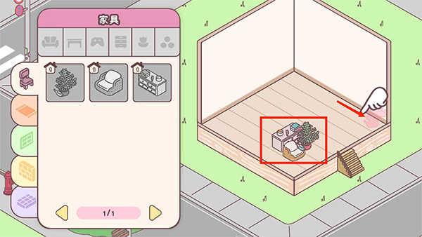 4、进入游戏主界面按照提示,拖动盆栽、沙发和柜子,移动到指定的位置,完成新手任务后,就是自己来布置这个有爱的小家了,
