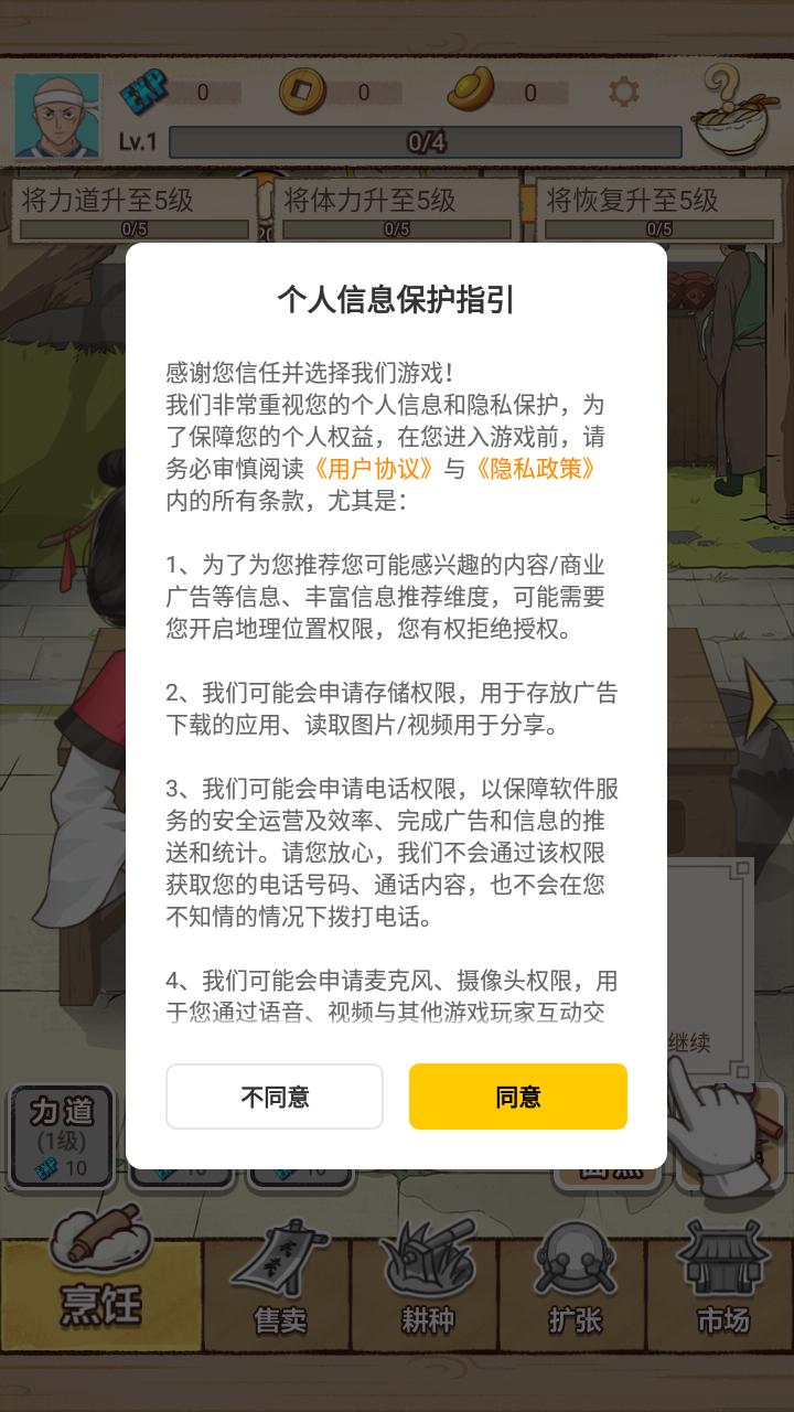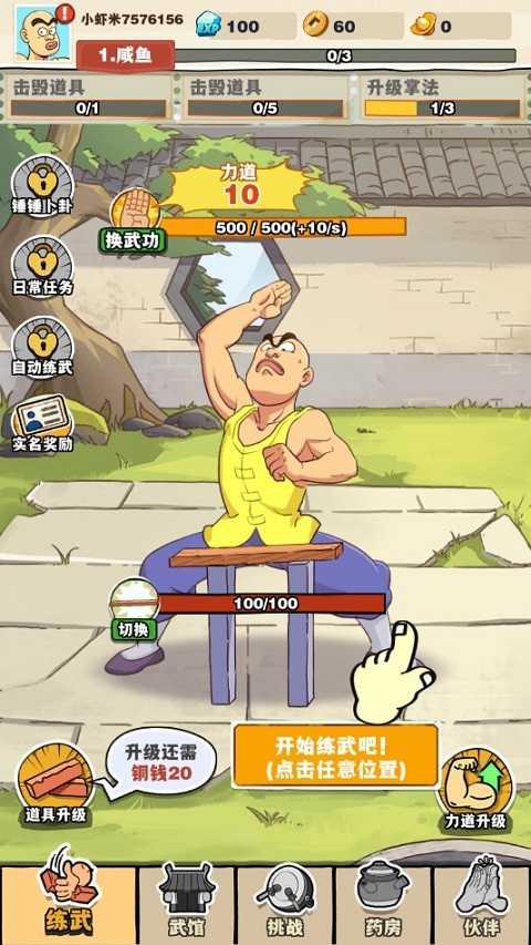 在界面的顶部,如图所示,在红框位置处是玩家要完成的主线任务,将力道提升到指定道具,或将体力升级到指定等级可以获得相对较高的经验值和金币奖励。经验值的成长,可以解锁新的玩法内容,如售卖、耕种、扩张和市场。