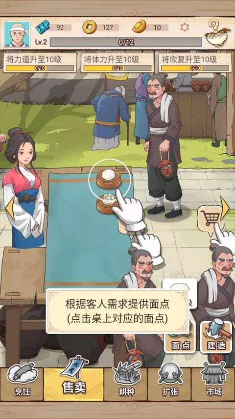 简单点来讲「售卖」就如同我们现在的摆摊,通过对「面点」的升级可以提升出售价格,期间你还能根据自己的布局,装饰自己的摊位。游戏里用于装饰的建造特色有很多,包括烹饪区的桌子、炉灶、小物件、小摆件等等。