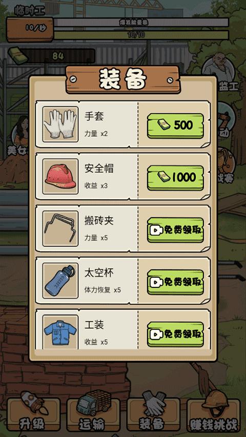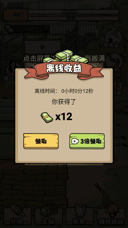 1、首先打开我的打工日记手机版,进入游戏后,点击屏幕进行搬砖,每搬满100块可以获得金币奖励;