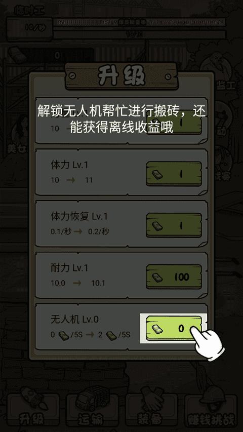 2、点击升级可以升级自己的属性,还可以解锁无人机帮忙搬砖;